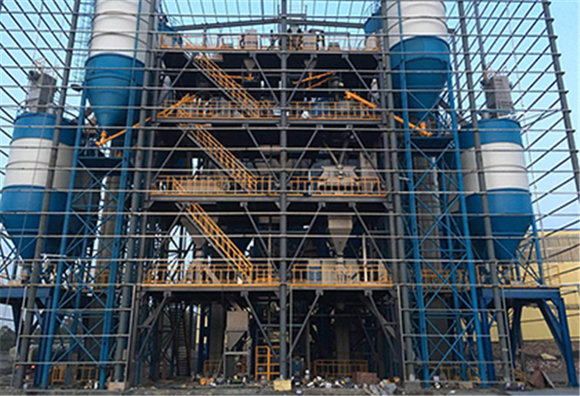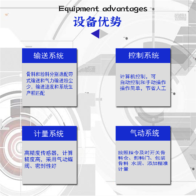 主要由提升輸送系統、計量配料系統、混合系統、儲料系統、包裝系統、除塵系統、控制系統、鋼架平臺等組成。